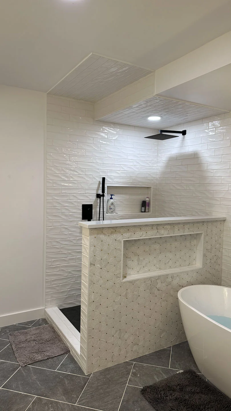 The pony wall was further enhanced with a mosaic hexagon tile, adding texture and visual interest. A niche was incorporated into the pony wall, offering convenient storage for shower essentials.